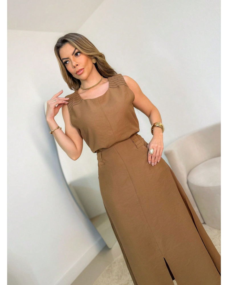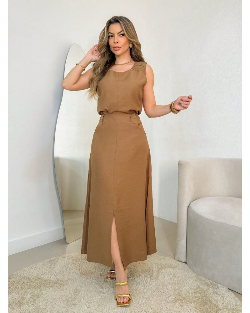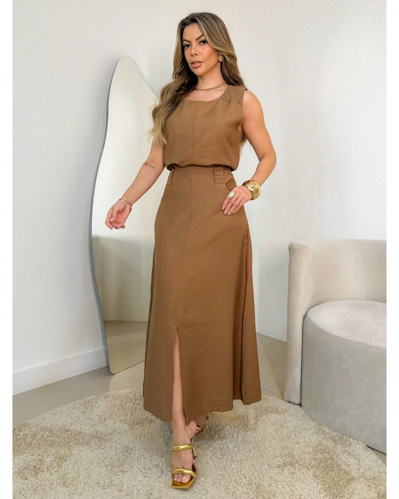 Conjunto longo de linho, composto por saia com fenda e blusa com detalhes nas alças
