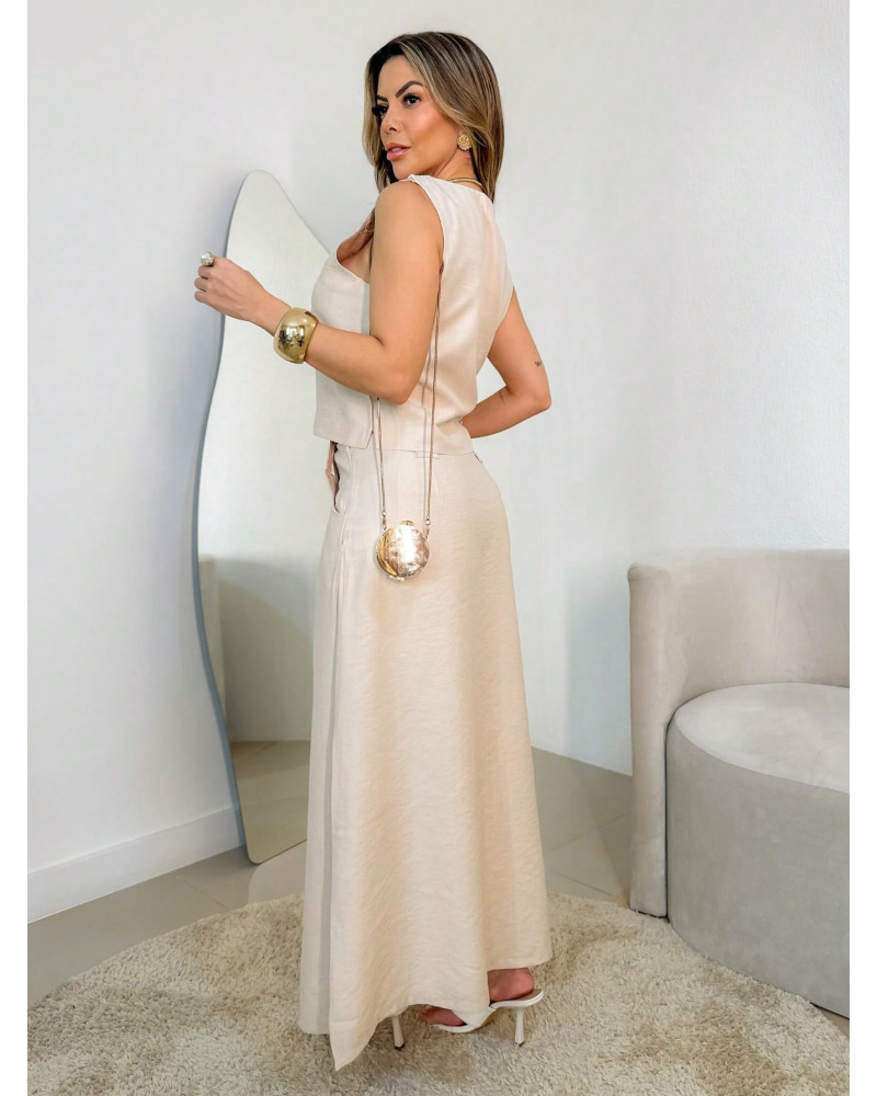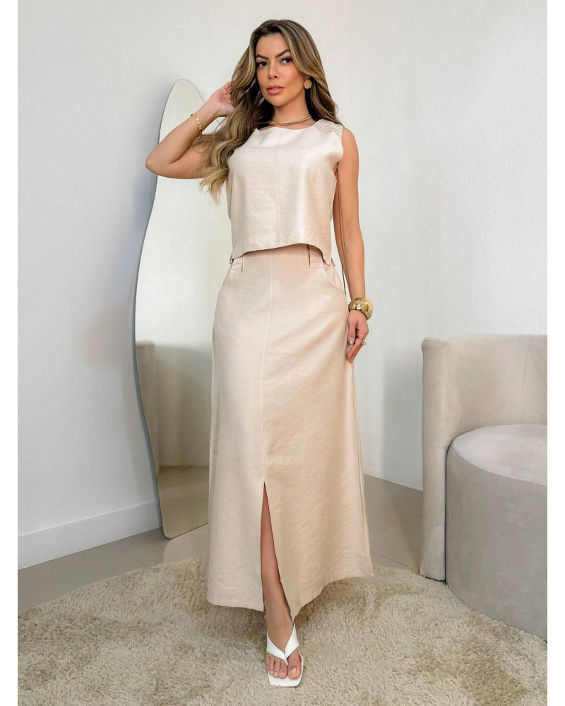 Conjunto longo de linho, composto por saia com fenda e blusa com detalhes nas alças