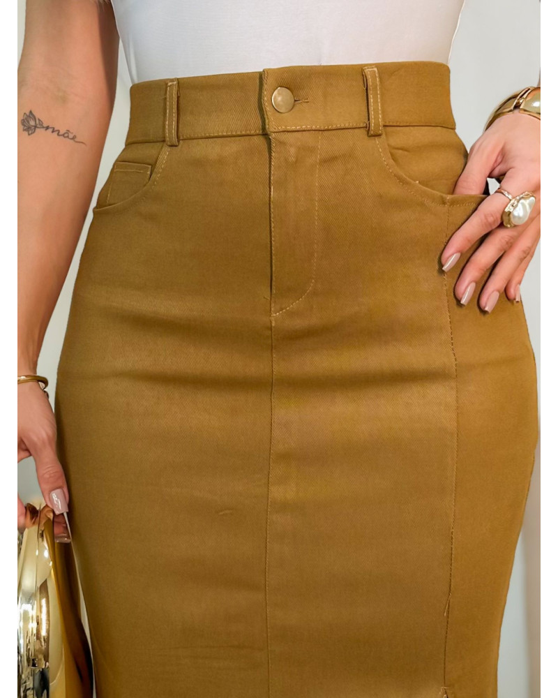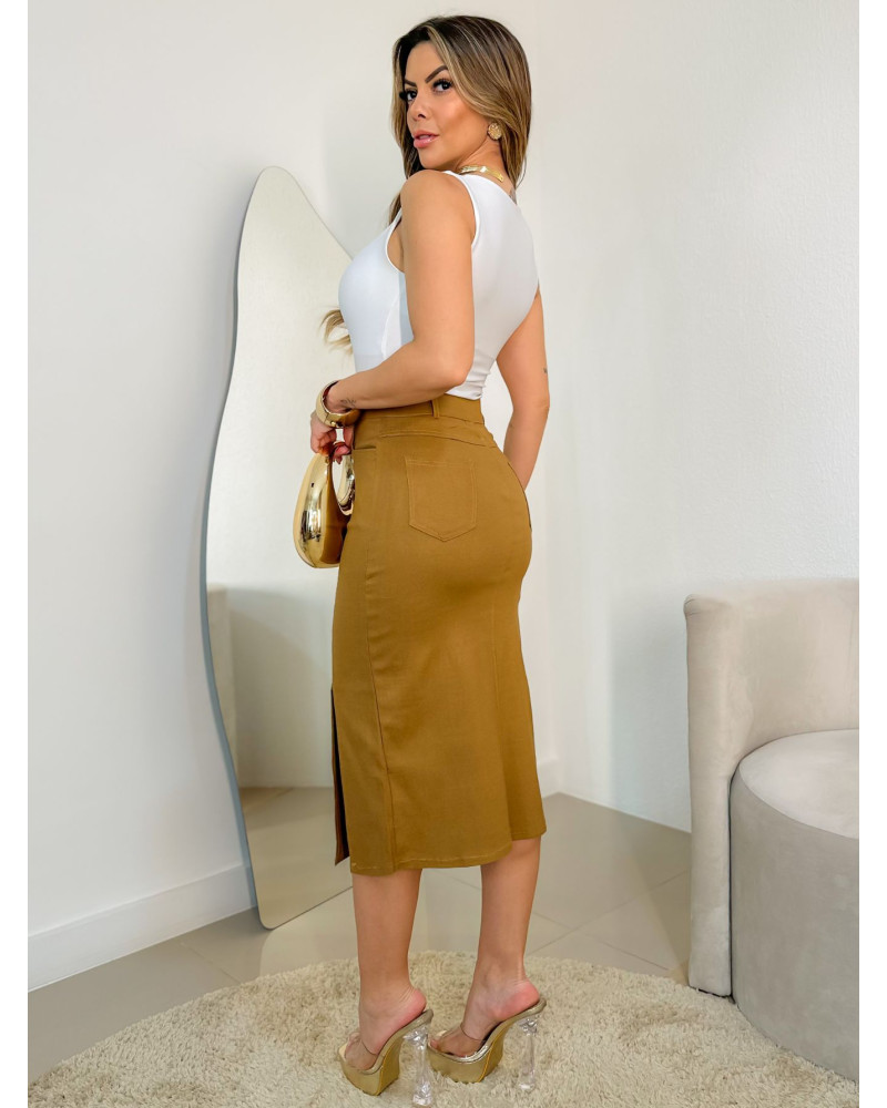 Realce seu estilo com sofisticação usando nossa Saia Midi de Sarja com Elastano! Desenvolvida com tecido encorpado e flexível, essa peça combina elegância e conforto na medida certa. Com modelagem reta, passantes na cintura, fechamento por zíper e botão frontal, ela valoriza a cintura e oferece um caimento impecável. O destaque fica por conta da fenda frontal, que garante um toque moderno e sensual sem perder a classe.